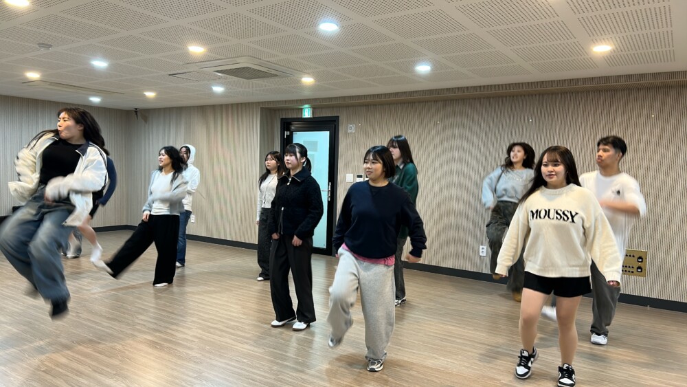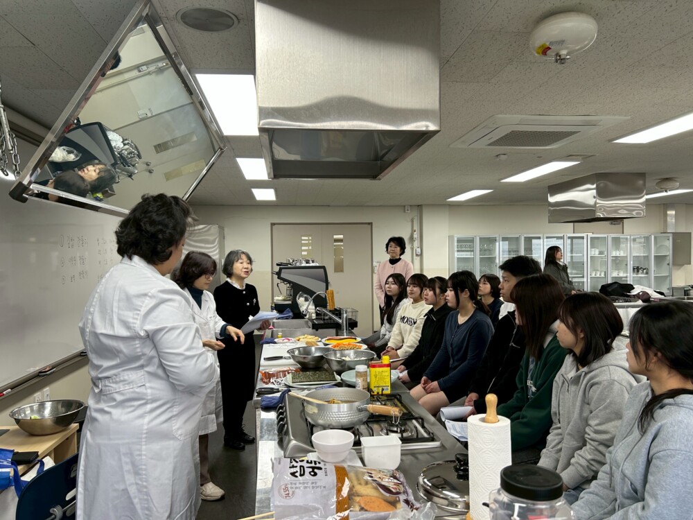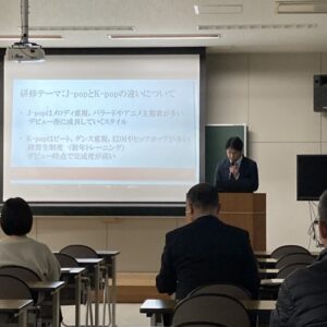 報告会では、研修に参加した学生が韓国人学生とペアを組み、キンパなどの韓国料理を共に調理し、食事をともにした経験について発表がありました。また、初めてK-POPダンスに挑戦し、最後に音楽に合わせて踊った際の達成感や感動についても語られました。さらに、韓服の試着を通して和服との違いを実感したことについても紹介されました。