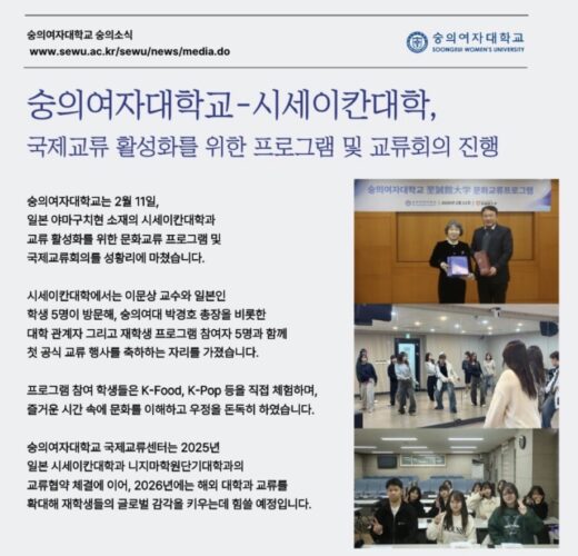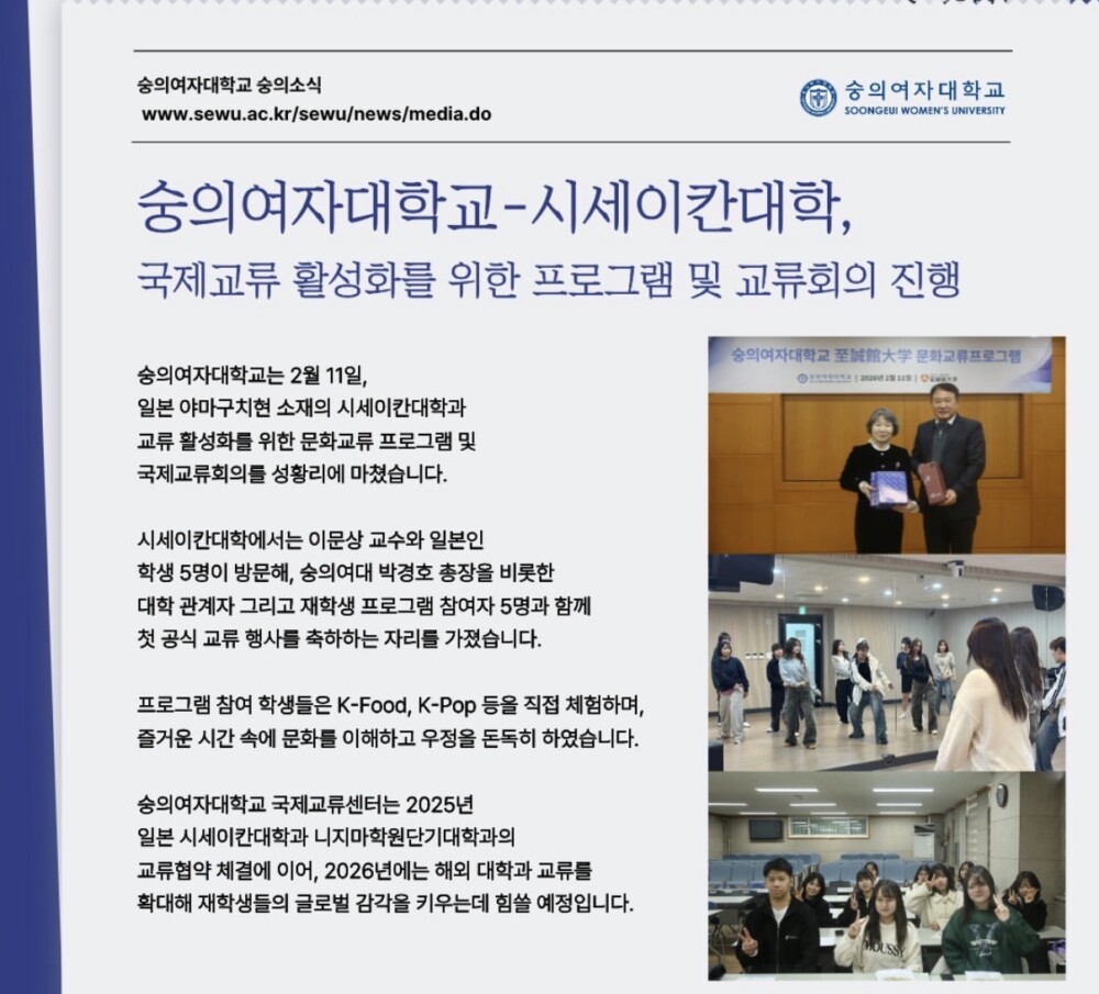 崇義女子大学校は、2月11日、日本・山口県に所在する至誠館大学とともに、国際交流の活性化を目的とした文化交流プログラムおよび交流会を実施した。