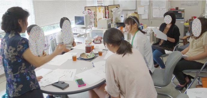 会話の場面設定は、日本語がわからない留学生との出会いの場であった。初めは話が通じず、もどかしがって目を丸くするなどハプニングが連続し、笑いが飛び交った。そのうち、段々慣れてくると「안녕하세요?저는 ○○예요.」、「你好!我姓○○,叫○○。」と自己紹介をし、覚えたばかりの言語でおやつや飲みものを勧め合ったり、手振り身振りを交えて何とか意思疎通をはかろうとする姿があった。授業が終わり、受講生たちと留学生の2人は、互いに「 再见!」と言い、つかの間の名残を惜しんでいた。2016.9.16 李 文相(イ ムンサン)